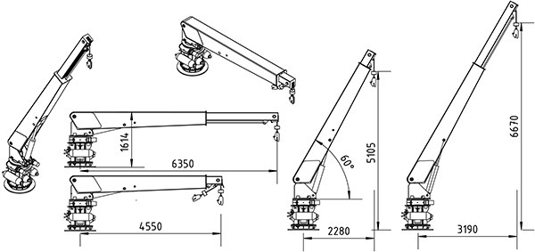 lifting primarly arm, telescopic and load rising the hook. This type of crane is available in several versions up to a safe working load of max. 2,2 tonm as rescue/MOB* crane (SOLAS certified).